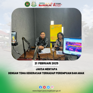 Pada hari Jum’at, 21 Februari 2025 pukul 09.00 WITA, Tim Intelijen Kejaksaan Negeri Poso melaksanakan kegiatan “Jaksa Menyapa” yang disiarkan secara langsung melalui Radio RPKP Poso serta streaming Instagram Kejari Poso.
