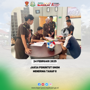 Pada hari Senin, 24 Februari 2025, pukul 13.30 WITA, bertempat di Ruang Tahap II Kejaksaan Negeri Poso, telah dilaksanakan penyerahan Tahap II dari penyidik kepolisian kepada Jaksa Penuntut Umum (JPU) Bapak Fadly Ilham, S.H.