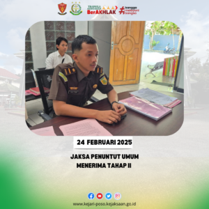 Pada hari Senin, 24 Februari 2025, pukul 12.14 WITA, bertempat di Ruang Tahap II Kejaksaan Negeri Poso, Jaksa Penuntut Umum (JPU) Bapak Sultan Haziqa, S.H. menerima Tahap II, yaitu penyerahan satu orang tersangka beserta barang bukti dari penyidik kepolisian.